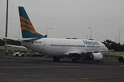 The aircraft involved was a Boeing 737-322 registration PK-MDE, msn 24600.[1] The aircraft first flew on 16 March 1990 and entered service with United Airlines on 2 April 1990.[6] The aircraft was delivered to Merpati Nusantara Airlines on 12 November 2009.[7] The accident resulted the aircraft written off. At the time of the accident, it had completed about 54,700 hours in 38,450 cycles. The APU had been unserviceable since 10 April 2010.[1] The destroyed aircraft is visible on Google Earth.