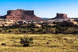 Merrimac Butte[2] is a 5,627-foot (1,715-metre) sandstone summit located in Grand County, Utah, United States, about 12 miles northwest of the town of Moab. Merrimac Butte is a thin, 200–600-foot-wide and 1,600-foot-long east-to-west butte with 200-foot-tall vertical Entrada Sandstone walls overlaying a Carmel Formation base.