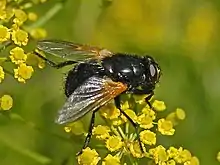 Adults can be found between late April and late October, particularly in cattle-rearing areas, on cow dung or basking in open ground. They mate in cow or horse dung. They feed on nectar and pollen of flowers of plants, especially Apiaceae (Heracleum and Pastinaca species),[5] or on overripe berries.[4] The larvae are carnivorous, and feed on other fly larvae within the dung.[4][6]