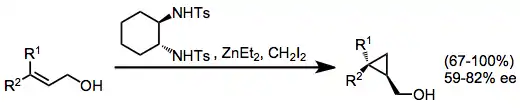 Simmons-Smith cyclopropanation, which employs carbenes derived from diiodomethane, is a popular alternative to rhodium-catalyzed cyclopropanation. In the presence of a chiral diamine, Simmons-Smith cyclopropanation is enantioselective; however, selectivities are not as high as the corresponding rhodium-catalyzed reactions.[26]