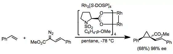 Methods for the stereoselective synthesis of cyclopropanes from diazocarbonyl compounds and olefins have relied on either the use of pre-formed chiral rhodium catalysts or chiral auxiliaries on the diazocarbonyl compound. For example, Rh2[S-DOSP]4 is a highly effective catalyst for the enantioselective cyclopropanation of alkenes.[9]