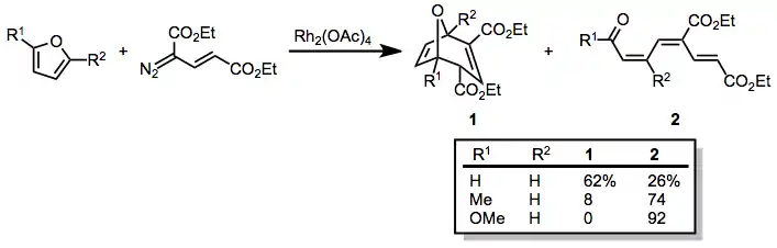 Furans react similarly with vinyl diazoacetates, although the intermediate cyclopropane may transform either into the Cope rearrangement product or an opened unsaturated carbonyl compound. The distribution of these products is highly dependent on the substitution pattern of the furan.[21]