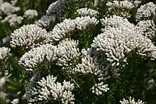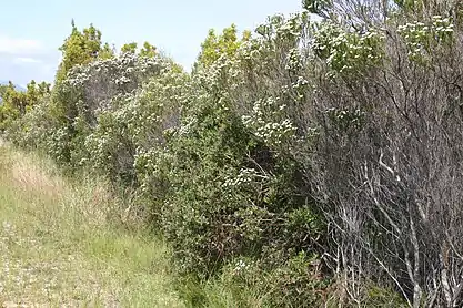 Metalasia muricata, commonly known as white bristle bush or blombos, is a hardy virgate or twiggy shrub with honey-scented flowers usually 2–4 m tall, woody with a rounded crown. It is native to the Cape Provinces of South Africa,[1] where it is an important component of the coastal and mountain fynbos regions. It is encountered in a number of forms in its extended distribution, some of which are tolerant of frost, wind and poor sandy soils.