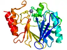 ![]() Cartoon diagram of the crystallographic structure of a zinc metallo-beta-lactamase from bacillus cereus (N-terminus = blue, C-terminus = red). The catalytic zinc ion is depicted as a grey sphere. | |||||||||