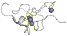 ![]() Cyanobacterial SmtA metallothionein bound to zinc ions. Cysteines in yellow, zinc in purple. (PDB: 1JJD) | |||||||||