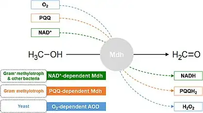 How the electrons are captured and transported depends upon the kind of methanol dehydrogenase. There are three main types of MDHs: NAD+-dependent MDH, pyrrolo-quinoline quinone dependent MDH, and oxygen-dependent alcohol oxidase.[2]