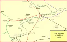 By an Act of 23 June 1864, the Methley Railway (as the branch had now been named) transferred to the joint ownership of the West Yorkshire Railway (former BW&LR), L&YR, and NER. The L&YR and the NER subscribed £25,000 of capital each, so that the Joint Line capital of £75,000 was equally shared.[3] A Methley Joint Committee was set up, each company appointing two directors: the first meeting was on 8 August 1864. Stations were to be at Stanley and Methley, also at Lofthouse, (at the junction with the main line). In addition, sidings were provided at Lofthouse Alum Works, and at several collieries; the line was double track. A fixed toll on all traffic would be paid into a joint fund. Up to 18 March 1867 each company had subscribed £34,500 for the joint line.[2][4]