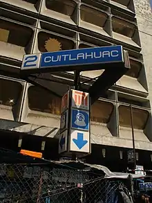 Cuitláhuac is a station on the Mexico City Metro. It is located in the Colonia Popotla and Colonia San Álvaro districts in the Miguel Hidalgo borough of Mexico City, to the northwest of the city center. It lies along Line 2.[2][3] In 2019, the station had an average ridership of 18,615 passengers per day.[4]
