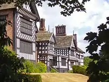 The east side of Bramall Hall, a Grade I listed building and Tudor mansion.
