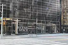 As designed, a canopy on 57th Street led to a double-height entryway with Italian-marble floors and walls, as well as a doorway with columns in a modified Doric style.[16][26] The entryway was 30 feet (9.1 m) tall and was largely covered by black glass similar to the rest of the facade.[26] There was a sidewalk canopy only in front of the residential lobby. This caused confusion for office tenants, who frequently went into the residential lobby by mistake before the doorman asked them to leave. After a renovation in 2006, a cantilevered, gabled canopy was installed in front of the office lobby.[27]