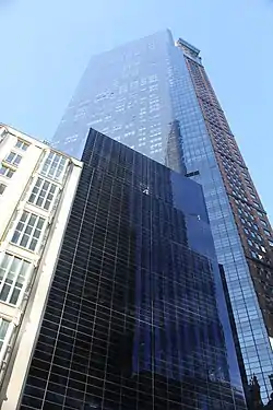 The concrete for the base and intermediate mechanical story was pumped from 57th Street and was lifted by a crane and bucket on 56th Street. A tower crane with two buckets was used to transport concrete from the ground to the upper stories. One bucket poured concrete on upper stories while the other was receiving concrete at ground level. Each floor slab in the base took four or five days to cast. The tower stories were completed at a rate of two per week, though the topmost stories were completed a rate of once every two days. The building was topped out on October 2, 1985.[28] As the facade was being completed, several of the glass panes cracked; shards of glass reportedly fell onto nearby streets, but no one was injured.[25][68] James Stewart-Gordon filed a lawsuit against Macklowe in late 1986, alleging that the falling glass and a sidewalk shed outside the construction site was reducing the restaurant's business.[68][69] After a New York state judge levied a $5,000 daily fine, Macklowe destroyed the shed.[69] The project ultimately involved six hundred workers.[28]