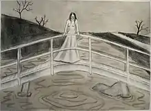 A well-known example in Chicano folklore is La Llorona, the weeping woman. There are varying different variations of La Llorona. One common account is that she is the ghost of a murderous mother who haunts near water like river banks or lake shores. She is always described as having long hair, down below her waist, and is seen wearing a white gown.[3] As the tale goes, her lover left her with their two children. Angry, she drowned her children in an act of revenge or grief. For that reason, she is doomed to walk the earth forever in search of her children.[4] La Llorona “serves as a cultural allegory, instructing people how to live and act within established social mores”.[5] Her tale is often used as a bedtime story to get children to go to sleep or behave when out in public. Given the popularity of the legend, there are many works done by “folklorists, literary critics, anthropologists, and feminist writers. Children's books, short stories, novels, and films” are just a few of the ways La Llorona has been inscribed into history.[1] As Gloria Anzaldua, a scholar of Chicana cultural and feminist theory, discussed in her article “How to Tame a Wild Tongue”, living on the U.S. side of the border made it difficult for Hispanics to relate to their national identity due to their oppression by Anglo-Saxon colonizers. These colonizing groups forced those of Hispanic descent to speak English at schools and other institutions. Anzaldua stated how she recalled being caught speaking Spanish at recess and got “three licks on the knuckles with a sharp ruler.”[6]