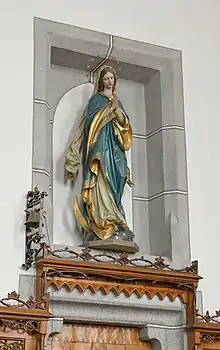 The most influential and significant figure to Mexican and Chicano women overall is the La Virgen de Guadalupe (Our Lady of Guadalupe). Known as the Virgin Mary, she represents the ideal woman in the Mexican culture. Although she is the preeminent representation of womanhood, she has since become an icon for women's subjugation and oppression.[17] As the catholic faith is a driving force within the Mexican American community, figures like the Virgin Mary hold very high and relevant importance. More importantly, she is one of the few figures of importance to the Chicana movement that is female. Being female, the Virgin Mary can therefore connect with all Mexican American women, as seen in Ruiz's work 'From Out of the Shadows'.[18] Some of the values upheld and reflected by the Virgin Mary include faith, strength, family, and independence. As the Chicana movement moves forward, the ability to fall back on the values of the Virgin Mary are considered and trusted to be able to overcome future barriers.[19]