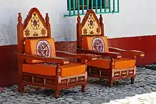 The palaces and noble home of the Aztecs had ornate furniture. Entire pieces of hardwoods would be carved into benches and tables, and other items. Furniture was inlaid with gold and some covered in animal skins.[39] A kind of shellac or lacquer existed in pre-Hispanic Mexico and was used in many ceramics. The Mendocino Codex mentions it as a kind of waterproof oil extracted from a worm called “axe” and mixed with oil from the prickly poppy seed or Mexican sage seed and pigments, which resulted in a paint.[12] After the Conquest, the Spanish demanded European style furniture, which was usually made by indigenous craftsmen. As colonial Mexico was Spain's gateway to Asia, oriental techniques such as parquetry and other types of inlay became common as well.[39] The state of Michoacán is a major producer of handcrafted furniture, which can be simply varnished or stained or painted in bright colors.[40]