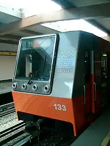 Line 5 has had different types of rolling stock. As of August 2021, 25 trains are operating in the line,[16] with a combination of MP-68 (coded as MP-68R93) and NM-73 (coded as NM-73AR) rubber-tired metro trains.[17][18] The MP-68 trains were built in 1968 in France by Alstom and they were modeled after the MP 59 trains on the Paris Metro.[19] With a service life of 25 years, all the MP-68 trains were restored and refurbished by Bombardier in 1993.[19] The second type, the NM-73 model, were built in 1973 in Mexico by Concarril with the supervision of Alstom.[20] Both models received further restoration works in 2016.[21]