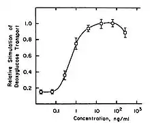 The shape of the 2-DG transport dose-response curve has an optimum at a mezerein concentration of approximately 50 ng/mL. This is atypical, since a dose-response curve usually is S-shaped. The explanation for this behaviour is unknown. Possibly, at high concentrations, mezerein is converted by enzymes that have low affinity for it. That would lower the effective concentration and thus decrease the effects. In this picture, a NOAE-level can be observed between mezerein concentrations of 0 to approximately 0.09 ng/mL. The concentration that gives half-maximal effects is reached for a low concentration of mezerein: about 0.7 ng/mL.