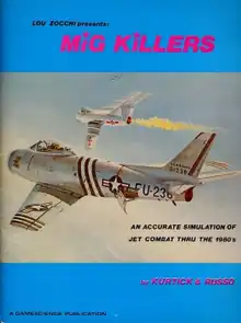 MiG Killers was designed by Michael Scott Kurtick and Rockland Russo, and was published by Gamescience in 1977. A supplement, MiG Killers Expansion Kit, was published the same year and included two more scenarios and larger aircraft data cards, although no new aircraft.[3] Gamescience promoted a further expansion called Air Strike that would introduce air-to-ground combat, but the expansion was never published.[3]