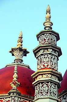 The eastern facade of the prayer hall has 3 openings, each of the openings are bounded by a slender engaged turret and the openings have a cusped arch on the outside surface. The mosque has three domes and eight big minarets, four on the front wall and four on the back wall. In addition, there are 12 smaller minarets in the space between the front and back walls.[5] The upper part of the North, South & West walls’ outer wall surfaces is profusely ornamented in plaster.