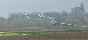 The Miami Bridge, also known as the McDaniel Memorial Bridge, is a new concrete girder bridge that was built to replace a cantilever through truss bridge over the Missouri River at Miami, Missouri between Saline County, Missouri and Carroll County, Missouri. The Miami Bridge carries Route 41. The Miami Bridge was built in 1939, and its deck was replaced in 1983 as part of a rehabilitation project. The old bridge's main cantilever span was 474.7 feet, while the two anchor spans were each 415 feet in length, resulting in a total cantilever truss length of 1304.7 feet. There were 11 approach spans, including four Warren deck truss spans, three on the northern approach and one on the southern approach. All remaining approach spans were steel stringer (multi-beam/girder) spans. Total bridge length including approach spans is 2,071.9 feet. The bridge's deck width is 23.0 feet and it has vertical clearance of 16.5 feet.