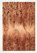 Krausz's paintings depict various spatial planes at once, embodying scripted messages of no literal significance. They are concerned with the emergence and dissolution of ciphers in infinite spaces. The works embody a kind of automatic writing arising from conductorial musical gestures in meditative spaces. The paintings are done with dry pigment on museum board and other mixed media.