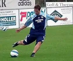 Owen returned to action after almost five months of layoff during the 1999–2000 season.[21] He played intermittently throughout the season and ended up ceding the Golden Boot to Kevin Phillips.[31] He had completed only six full games by January and, during a frustrating spell punctuated by recurring breakdowns,[31] had managed to stay the 90 minutes only three times since mid-October. Owen injured his hamstring once again while playing against Middlesbrough in January. He remained out of action for well over a month and later received treatment from German doctor Hans-Wilhelm Müller-Wohlfahrt.[32] The persistent hamstring problems ended up robbing Liverpool of Owen for a third of a season in which a lack of goals eventually cost them a place in the Champions League.[32]