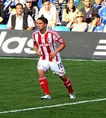 On 4 September 2012, Owen joined Stoke City on a one-year contract.[128] He was handed the number 10 shirt from the departed Ricardo Fuller and made his debut in a 1–1 draw against Manchester City on 15 September.[129] The start to his time at Stoke was hampered by a hamstring injury.[130] Owen scored his first and only goal for Stoke on 19 January 2013 in a 3–1 defeat at Swansea City, his first goal since 25 October 2011. In doing so, he became only the seventh player to reach 150 Premier League goals.[131]