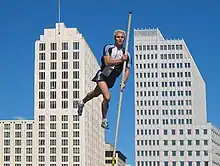 Michael Stolle pole vaulting at the Potsdamer Platz in Berlin 2004