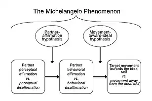 The Michelangelo phenomenon is an interpersonal process observed by psychologists in which close, romantic partners influence or 'sculpt' each other.[1] Over time, the Michelangelo effect causes individuals to develop towards what they consider their "ideal selves". This happens because their partner sees them and acts around them in ways that promote this ideal.