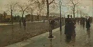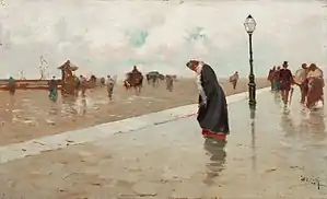 His most mature works, characterized by a smooth brushstroke and a robust and vibrant style, are from the early twentieth-century: he appreciated sad autumn atmospheres, gray skies, and cold windy days, which he portrayed with dim and melancholic tones. In 1901 he composed Donna a passeggio, in 1903 Paesaggio paludoso, in 1906 Via Libertà and Donna che raccoglie i fiori, in 1908 Scogli a riva, in 1910 Alberi a riva, Barche, Marina con scogli. Organized by Edoardo Alfano, he held a large personal exhibition in 1910 in Palermo where thirty-six of his works were presented. In 1911 he was awarded the gold medal at the National Exhibition of Rome for the picture Ultime foglie (Il viale della Libertà in una giornata di pioggia) of 1906.[3][4][5]