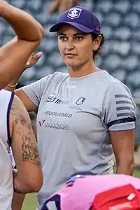 In 2013, she was appointed the senior coach of the Melbourne Football Club's women's team during the women's exhibition series and in the same year she was named as the Football Woman of the Year.[5] She coached Melbourne for all three years of the exhibition series - winning 5 out of the 6 matches and in February 2016, she became the first female assistant coach in Melbourne's history and the second in AFL history when she became the player development and welfare coach.[6] Due to family reasons she left the club in July and became the inaugural coach of the Fremantle AFL Women's team.[7]