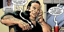 Mickey becomes involved with counterfeiters, betrays them, and is saved from retribution by Microchip.[24] After the Punisher catches him trying to steal telephone card numbers at an airport, Mickey tips the vigilante off about Russian mobsters who are arranging a deal with a Vietnamese gangster named Randy Kwoc.[25] Later, the Punisher blows up Mickey's chop shop, and discusses his ties to an up-and-coming drug lord known as Cringe.[26] The Punisher then moves into Mickey's trailer with the two hackers he had recruited to replace Microchip, with whom he had a falling-out, not knowing that Mickey is secretly in contact with Cringe, who is really Microchip.[27][28][29]