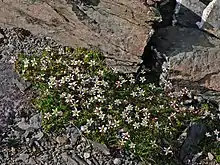 Micranthes tolmiei is a species of flowering plant known by the common name Tolmie's saxifrage, or Tolmie's alpine saxifrage. It is native to western North America from Alaska to Montana to California, where it grows in rocky mountain habitat types, especially in alpine climates, such as talus and fellfields. It is a small perennial herb growing in mats of creeping stems lined with thick, fleshy leaves each up to 1.5 centimeters long. The inflorescence arises on a stout, erect peduncle with a few stubby bracts midway up. The flowers have narrow white petals and petal-like white stamens.