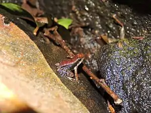 ![]() Micrixalus elegans amongst leaf litter and fallen logs near a fresh-water stream. |