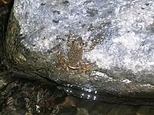 Intruding males will foot flag and kick at amplexed pairs.[3] The frogs in amplexus will respond by kicking the intruder and may move to another area to avoid further harassment. Females dig a 2 x 2 x 2 cm underwater cavity in which to lay their eggs, which are about 2.5 mm in diameter with their jelly coating. Clutch sizes of 154 have been reported for this species.[3] Once the eggs have been laid, the tadpoles are left to care for themselves, as M. saxicola provides no parental care, and parents do not return to the site of oviposition.