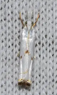 The length of the forewings is about 8 mm. The forewings are white with angled lines near the costa. There are black dots along the inner margin of the median line.[3] Adults are on wing between May and September in most of the range, but year round in Florida.