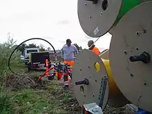 For telecommunications, cables can be installed in water, in air or underground. In the latter case, the cables might be direct buried or installed in ducts. The first is more common for copper balanced cables; the latter for fibre optic cables. The ducts in which the fibre optic cables are installed are usually made of polyethylene. They have a size ranging from typically 25 mm to 100 mm. Sometimes they are installed as subducts in larger ducts. These larger ducts can also consist of other materials, like concrete. The installation of fibre optic cables in ducts can be done by pulling or by cable jetting.