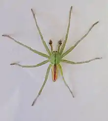 The cephalothorax and the long legs of the females are bright green, with a lighter green abdomen showing a darker green median stripe. The eight eyes are arranged in two rows and surrounded by white hairs.[4] Males are dark green-olive and have a narrower abdomen, with red sides and a red to red-brown median stripe bordered yellow.[8] Young spiders have a yellow-brown cephalothorax, with dark marginal and median stripes. Only after the last molting in the following spring the juveniles assume the typical coloration of the adults.