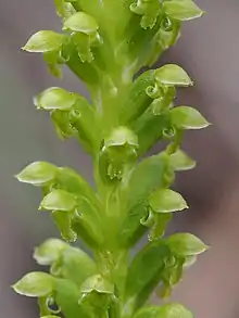 Microtis media, commonly known as the common mignonette orchid,[2] is a species of herbaceous plants of the family Orchidaceae endemic to the south–west of Western Australia. It has a single tubular leaf and up to one hundred small, yellowish green flowers arranged along the flowering stem.