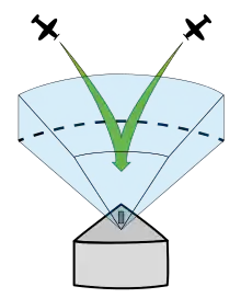The azimuth coverage extends: Laterally, at least 40 degrees on either side of the runway centerline in a standard configuration. In elevation, up to an angle of 15 degrees and to at least 20,000 feet (6 km), and in range, to at least 20 nautical miles (37 km) (See FIG 1-1-8.)