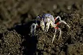 Mictyris brevidactylus is a species of crab found in Japan, China (including the type location, Hong Kong), Taiwan, Singapore, and parts of Indonesia (Karakelong, Bawean and Ambon Island).[2] The adults have a light-blue carapace and scarlet-jointed legs, while juveniles are yellowish-brown. M. brevidactylus is gregarious and burrows into the sand when disturbed, in a corkscrew motion.[3]