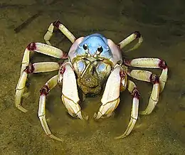 Mictyris longicarpus, the light-blue soldier crab, is a species of crab that lives on sandy beaches from the Bay of Bengal to Australia; with other members of the genus Mictyris, it is "one of the most loved crabs in Australia".[2] Adults are 25 mm (1 in) across, white, with blue on their backs, and hold their claws vertically. They feed on detritus in the sand, leaving rounded pellets of discarded sand behind them. The males may form into large "armies" which traverse the beach at low tide, before the crabs dig into the sand to wait for the next low tide.