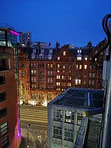 Built at the junction of Peter Street and Lower Mosley Street opposite Manchester Central railway station, terminus for Midland Railway express trains to London St Pancras, the hotel was designed by Charles Trubshaw and constructed between 1898 and 1903 for the Midland Railway Company at a cost of more than £1 million. In 1908, The Railway News reported that the hotel had over 70,000 guests in its first year and described it as a "twentieth century palace".[3] The hotel had a 1,000-seat purpose-built theatre where opera, drama and early Annie Horniman performances were staged, and a roof terrace where a string quartet performed.[4]