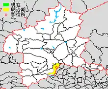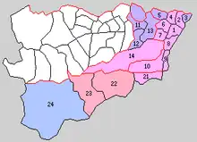1. Fujioka, 2. Kanna, 3. Shin, 4. Ono, 5. Yawata, 6. Midori, 7. Hirai, 8. Mikuri, 9. Onishi, 10. Sanbagawa, 11.Yoshii, 12.Tago, 13. Irino, 14. Hino, 21. Mihara, 22. Kamikawa, 23. Nakasato, 24. Ueno: areas 1 through 10 were formerly Midono District
