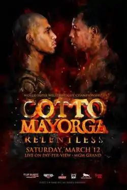 Miguel Cotto vs. Ricardo Mayorga, billed as Relentless, was a boxing super welterweight fight for the WBA (Super) super welterweight championship.[1] The bout was held on March 12, 2011, at MGM Grand Garden Arena, in Las Vegas, Nevada, United States.[2][3] Cotto won the fight via technical knockout in the twelfth round.[4]