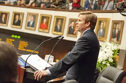 During his first term as Senate President, he oversaw the balancing of the state's budget which suffered a $4 billion shortfall, without raising taxes or fees. Beyond that the Senate also authorized SmartCap, a constitutional amendment that, if adopted, will place strict caps on government spending, as well as the Health Care Freedom Amendment which fights back against the government takeover of health care.[31]