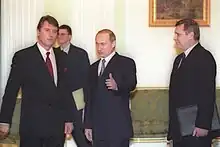 Mikhail Mikhailovich Kasyanov (Russian: Михаи́л Миха́йлович Касья́нов, IPA: [mʲɪxɐˈil mʲɪˈxajləvʲɪtɕ kɐˈsʲjanəf]; born 8 December 1957) is a Russian politician who served as Prime Minister of Russia from 2000 to 2004. Previously, he had served as First Deputy Prime Minister in 2000 and Minister of Finance from 1999 to 2000. During the 1990s, he worked in President Boris Yeltsin's administration in different positions before joining President Vladimir Putin's first administration. He has the federal state civilian service rank of 1st class Active State Councillor of the Russian Federation.[1]