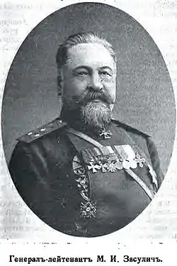 Mikhail Ivanovich Zasulich (Russian: Михаи́л Ива́нович Засу́лич) (December 24, 1843 1910) was a general in the Imperial Russian Army, noted for his role as commander of the Russian 2nd Siberian Army Corps in the Battle of the Yalu River, of the Russo-Japanese War of 19041905.