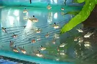 Bolivian rams are biparental, open-spawning cichlids.[8] Limited data are available on reproduction in the wild; in captivity, though, courtship is known to involve various body movements including head shaking, quivering, and preparation of spawning sites, including shallow pits. These behaviours are mainly undertaken by the male and in aquaria are known to last around 48 hours.[3] After courtship, the female deposits some 100–200 ovoid, brownish-coloured eggs on the chosen surface, normally a flattened stone, but occasionally a leaf.[3] The eggs are laid in lines; when the female has laid one line, the male passes over it and fertilises the eggs; the female then continues on to the next line and so on until egg laying is complete. In aquariums at 27 °C (80 °F), eggs take about 60 hours to hatch. During this time, the clutch is primarily cared for by the female, which fans the eggs and often adds sand to the clutch, possibly to camouflage the eggs.[3] Newly hatched fry are transported by the mouths of the parents to the shallow pits dug by the male during courtship and moved regularly between pits. The fry become free-swimming after seven days and are led about in a dense school by the parents for foraging.[3]