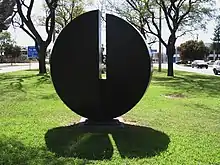 Inge King's Sculpture Black Sun 1975. Exhibited during the 6th Mildura Sculpture Exhibition (the 1975 Mildura sculpture triennial, an opening feature for Arts Victoria 75) and purchased for Mildura Arts Centre. Located on Deakin Avenue, between Eleventh and Twelfth Streets, Mildura. Steel, Painted Black, edition 2 239 X 208 x 72.