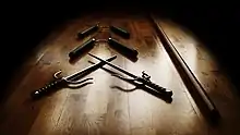Mortal Kombat co-creator and producer Ed Boon described Mileena and Kitana as the "female versions of Scorpion and Sub-Zero", two palette-swapped ninja characters from the original game.[57] Character creator John Tobias chose Mileena's name as he felt "it had a pleasant sound to it, which either helped hide her grotesque appearance or exposed a hidden inner beauty", while hers and Kitana's storylines were borne from "the conflicts of sibling rivalry and rebelling against authority".[58] Mileena's signature weapon in the series is a pair of sai, along with recurring teleport-kick and ground-rolling-attack special moves while she utilizes either her sai or cannibalistic tendencies in most of her Fatalities.